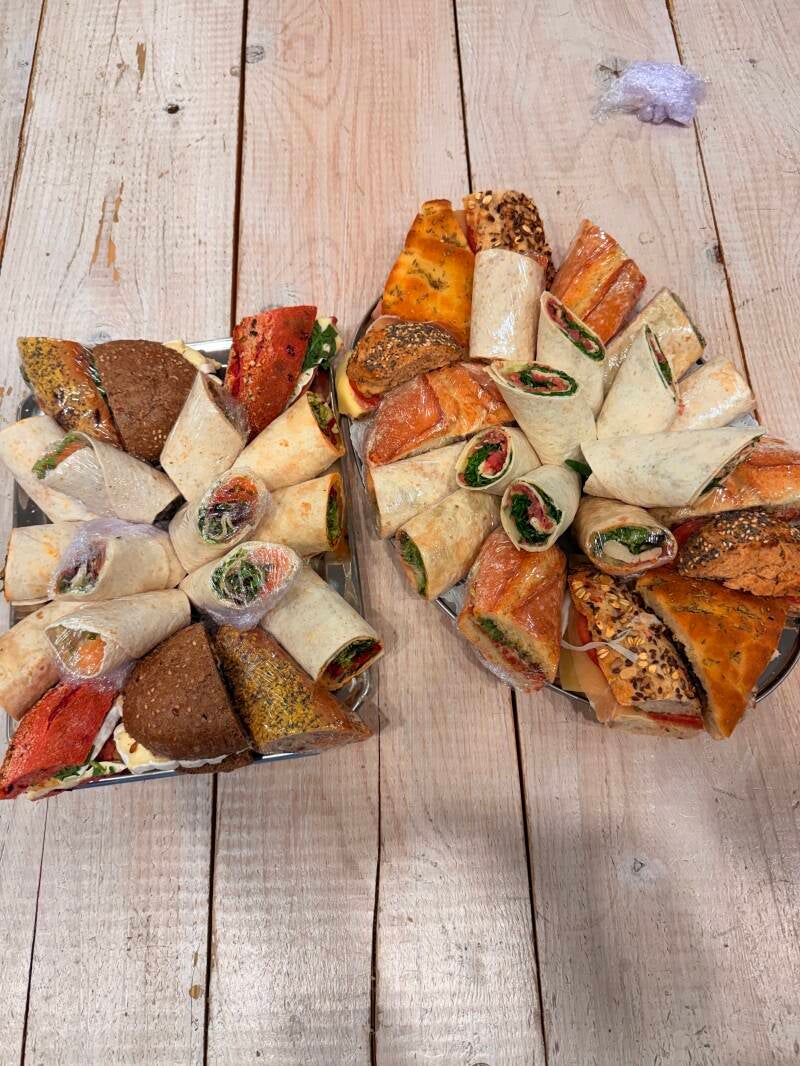 Alle broodjes zullen door ons gehalveerd worden, alle wraps door drieën en onze sandwiches in vieren geselecteerd en gepresenteerd worden op schaal.